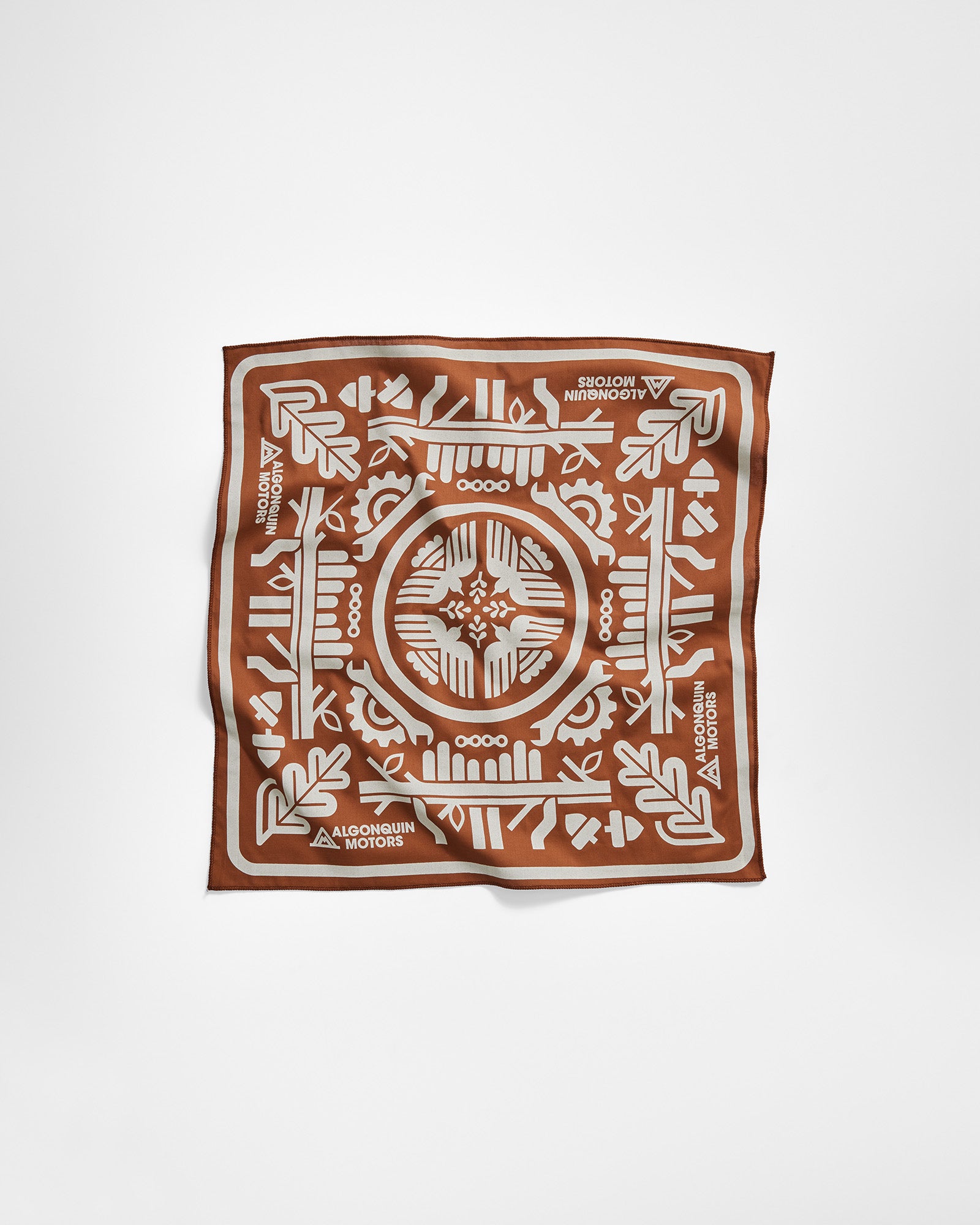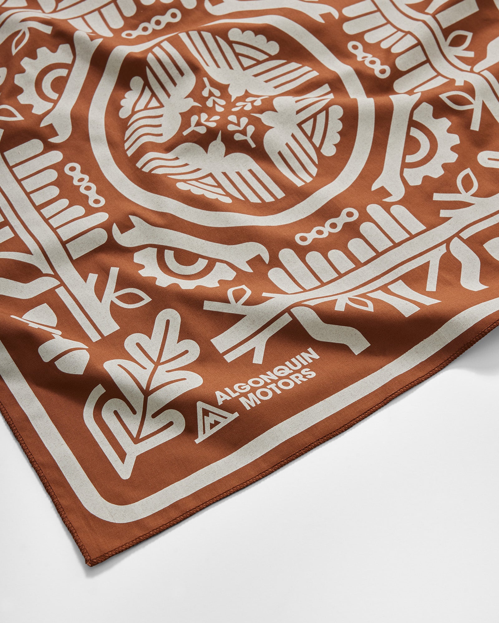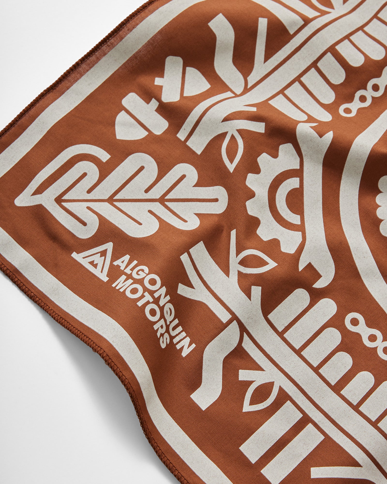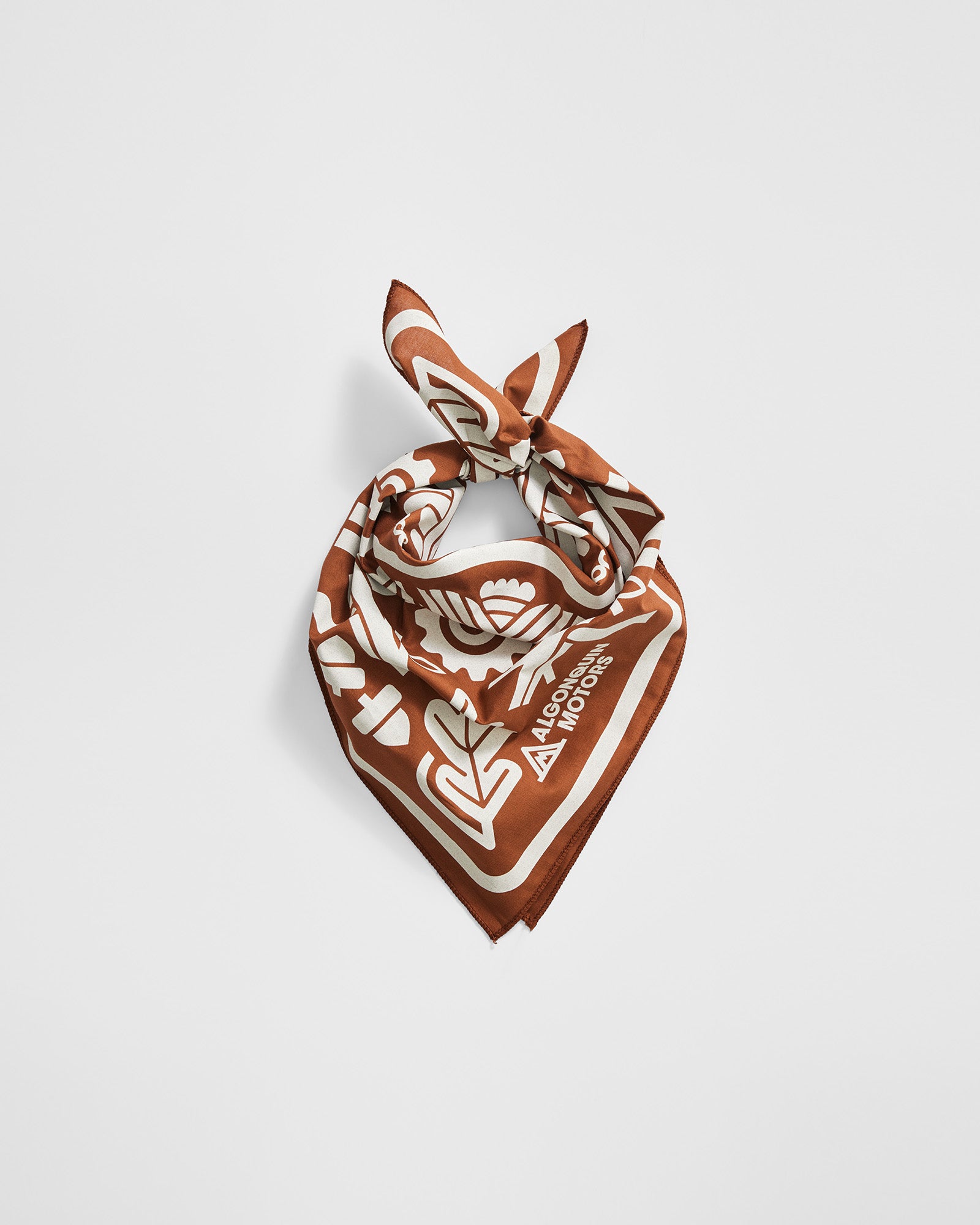 This walnut brown bandana is made of top-quality cotton cambric fabric milled in Japan with a serged hem and is made in the USA, screen printed in Canada.