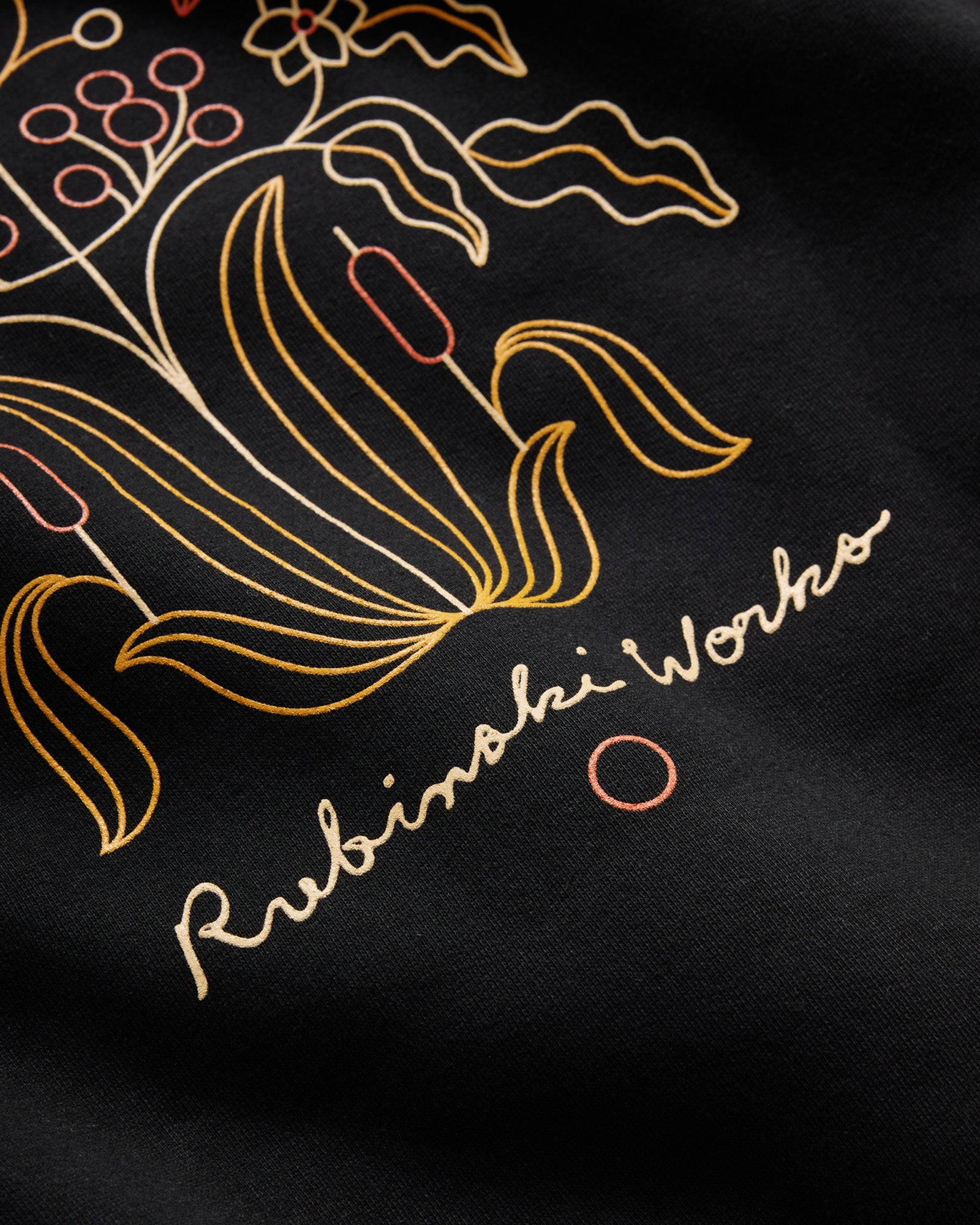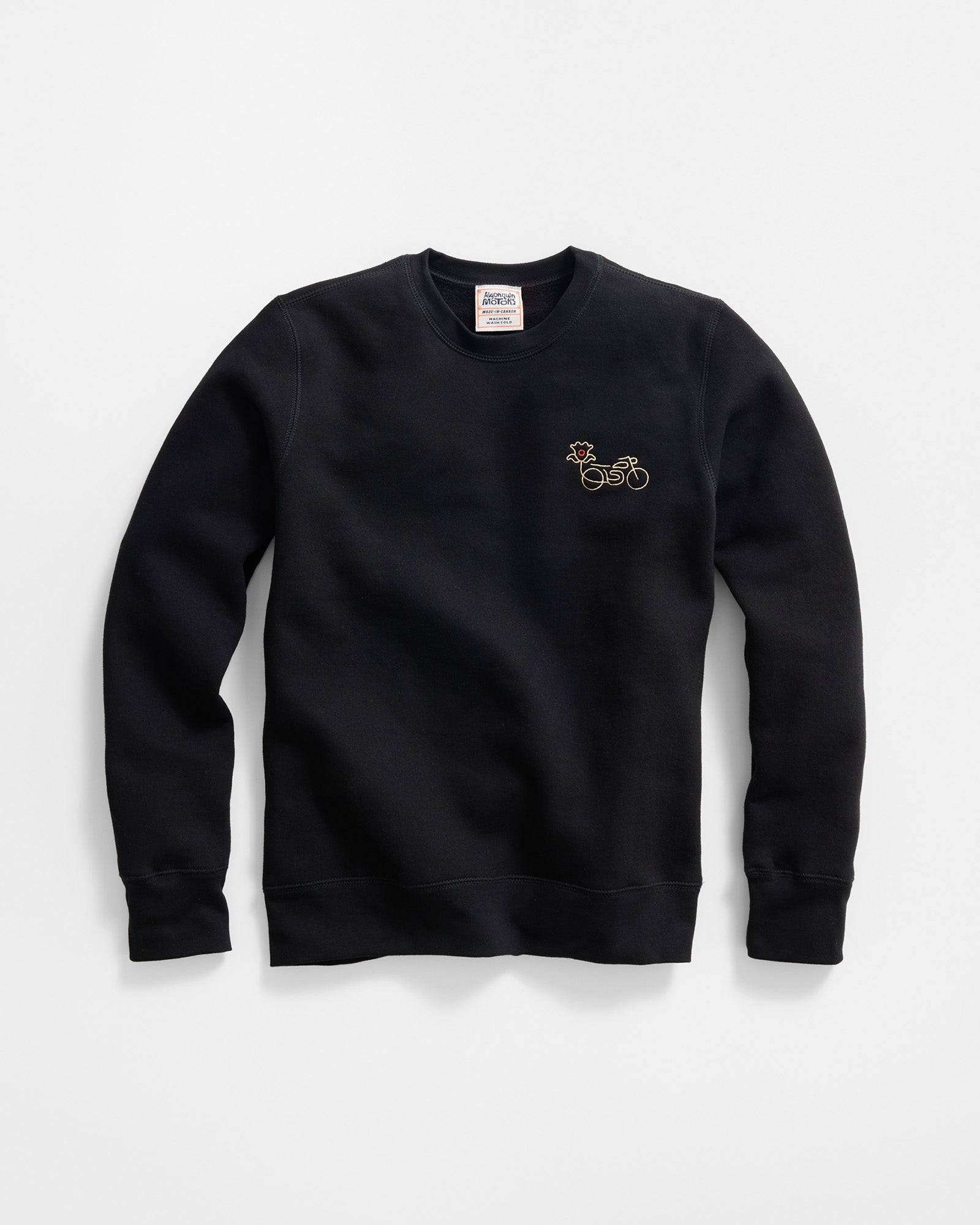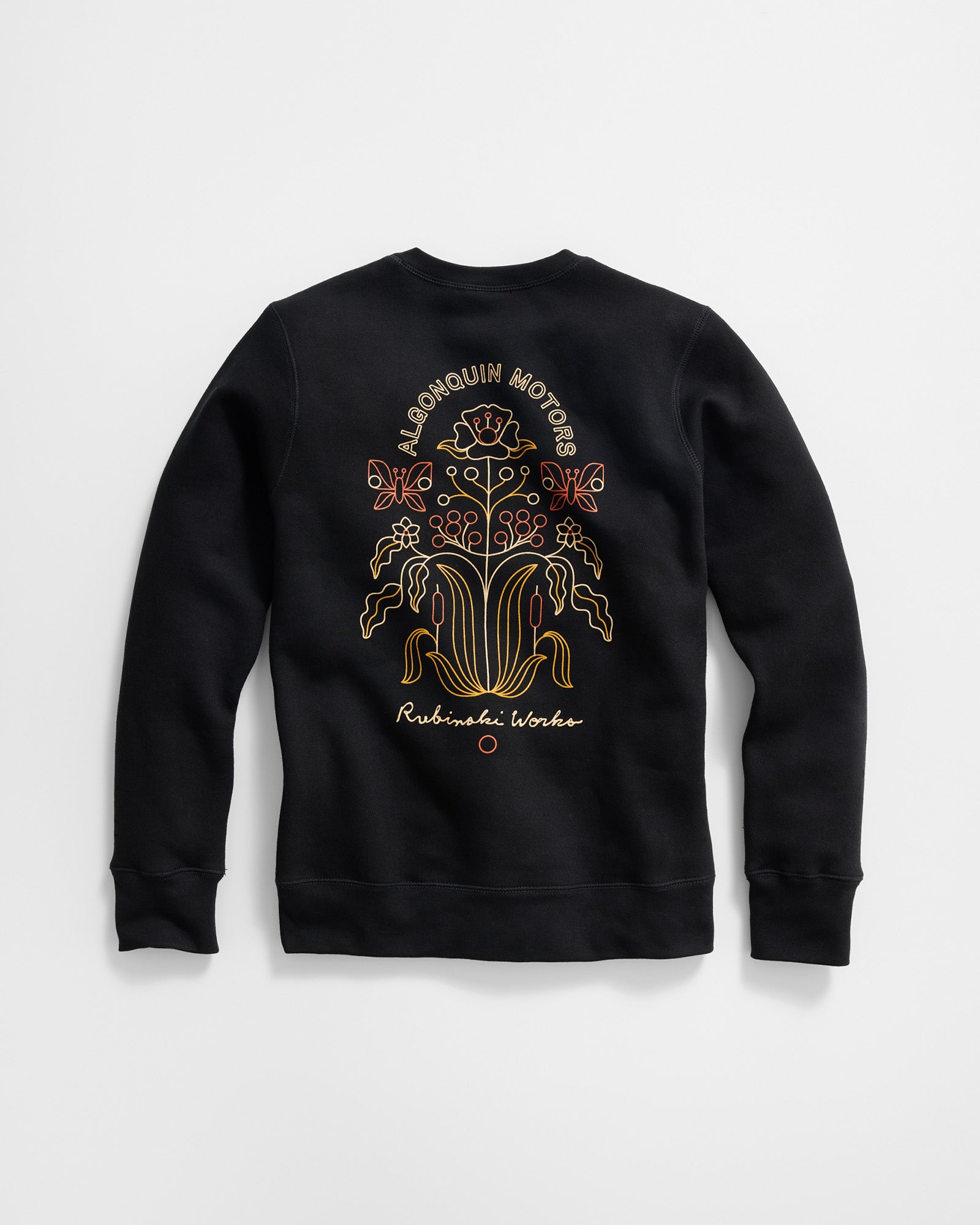 This ultra heavyweight crewneck sweatshirt features reinforced 3-needle flatlock stitching on all seams for exceptional durability. If you’re familiar with our products, you know that you’re getting the highest quality Canadian-made apparel. In a deep and rich black hue, this crewneck sweater boasts an embroidered lapel and an intricate design screen-printed on the back, both created by Madison Holler of Rubinski Works.